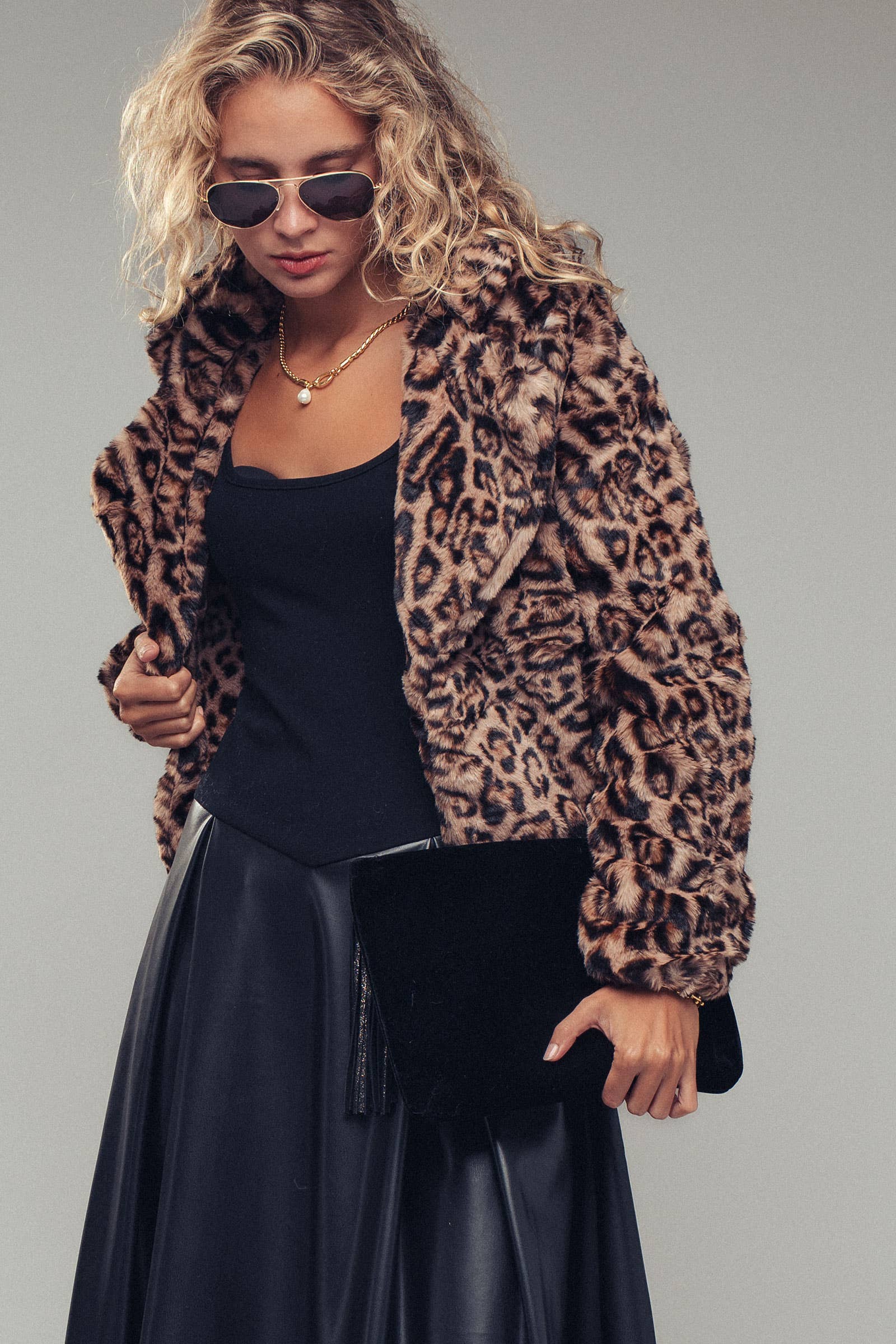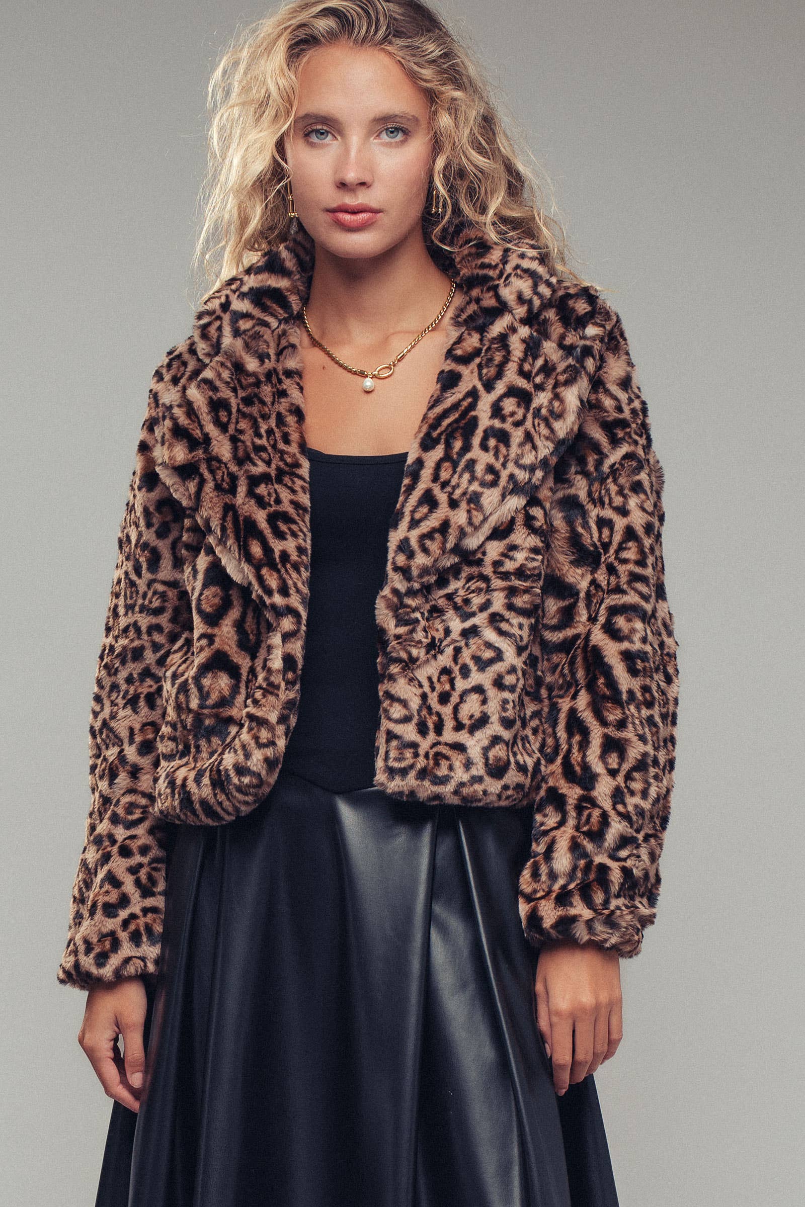 Make a glamorous statement with this plush leopard print jacket. Crafted from exceptionally soft faux fur, this piece is designed to bring a touch of luxury to any outfit. The chic cropped, bomber-style silhouette and wide lapel collar create a bold and fashion-forward look for cold weather.