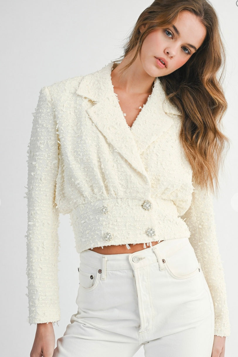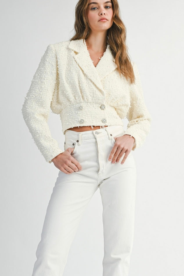 Tweed Collar Cropped Jacket With Rhinestone Button FINAL SALE